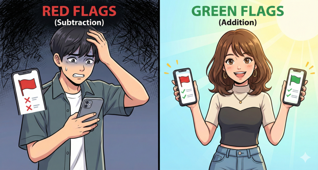 それは、相手の欠点を探して切り捨てる「レッドフラッグ(危険信号)」から、相手の誠実さや精神的な成熟度を肯定的に評価する「グリーンフラッグ(安全信号)」への劇的な変化です。